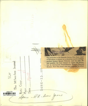 The pretender to the Spanish throne, Don Juan, count of Barcelona, is shown at a shooting match with his mother, former Queen Vittoria, and his wife. He had possibly the best chance to regain his throne, but he denounced generalissimo Franco, Spanish dictator. Now Don Juan's son may someday be called. Spain - royal family - Don Juan.