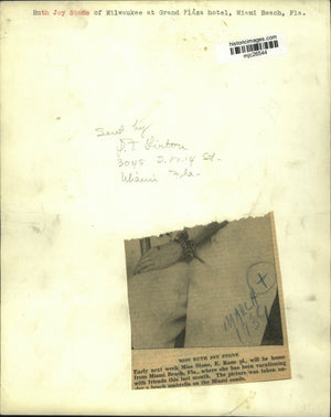 Miss Ruth Joy Stone. Early next week Miss Stone, E. Kane Pl., will be home from Miami Beach, Florida, where she has been vacationing with friends this last month. The picture was taken under a beach umbrella on the Miami sands. Ruth Joy Stone of Milwaukee at Grand Plaza Hotel, Miami Beach, Florida.