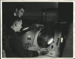Guided Missiles, Nike Installation sites Milwaukee Wisconsin Electronic symbols on this radar screen will show air activity in the Milwaukee area. The radar is part of a new command system for Nike antiaircraft defense. It will provide information faster in the event of attack and identify targets accurately. Seated is 1st Lieutenant Jack R. Crewse, Mountain Grove, Missouri. With him is Matthew McCombe, manufacturer's representative. The new system has been installed at the Nike headquarters.
