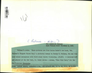 Pullman's pride. These pictures are from Lucius Beebe's new book, "Mr. Pullman's Elegant Palace Car," a pictorial homage to George M. Pullman, the man whose name became synonymous with first class travel. A railroad buff and admirer of the Old West, Mr. Beebe writes a column, "This Wild West," for the San Francisco Chronicle. (Railroads-Historic)