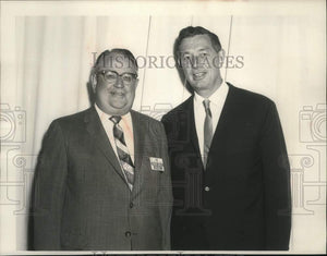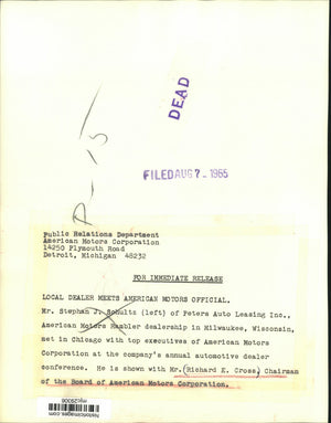 Local Dealer Meets American Motors Official. Mr. Stephan J. Schultz (left) of Peters Auto Leasing Inc., American Motors Rambler dealership in Milwaukee, Wisconsin, met in Chicago with top executives of American Motors Corporation at the company's annual automotive dealer conference. He is shown with Mr. Richard E. Cross, Chairman of the Board of American Motors Corporation.