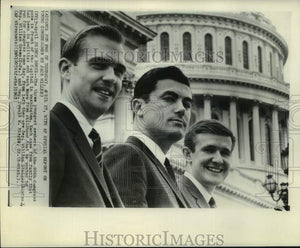 New Breed-The three youngest members of the 90th Congress pose in front of the Capitol in Washington. Each came from family that had been in politics and each knew from childhood that he wanted to run for congress some day. From left they are Representative William Steiger (R-Wisc.), Representative William Green (D-Pa.), and Representative Donald W. Riegle, Jr. (R-Mich.).