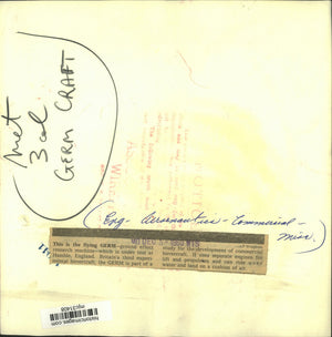 This is the flying GERM-ground effect research machine- which is under test at Hamble, England. Britain's third experimental hovercraft, the GERM is part of a study for the development of commercial hovercraft. It uses separate engines for lift and propulsion and can ride over water and land on a cushion of air. England-aeronautics-commercial-misc.