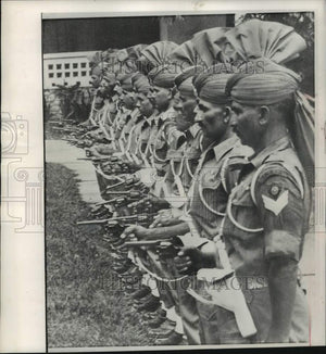 Members of the Indian contingent (of United Nations police force) forces stationed in Leopoldville lined up with drawn revolvers at an inspection outside their headquarters. United Nations Pistols.