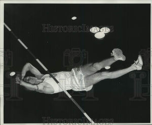 1960 Press Photo Pole vaulter Bob Gutowski sails over bar at a track meet
