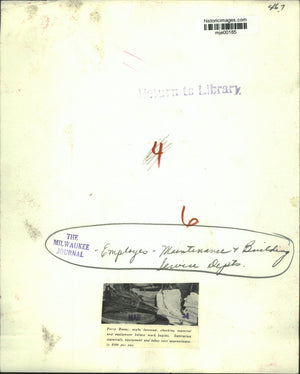 Perry Bonar, night foreman, checking material and equipment before work begins. Sanitation materials, equipment and labor cost approximately $500 per day. The Milwaukee Journal-Employees-Maintainace & Building Service