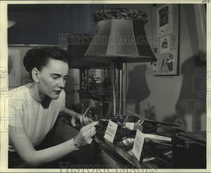 1951 Press Photo Woman looking at a lamp at the Milwaukee Journal Hobby Show, WI