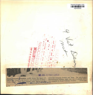 South Vietnamese students pulled down the figure of peace that stood in the French war memorial in downtown Saigon. They also toppled other figures in the memorial honoring French war dead. The anti-French demonstration Tuesday night was one of several which have erupted in South Vietnam recently (United States) (Wars) (Vietnam) (Demonstrations)