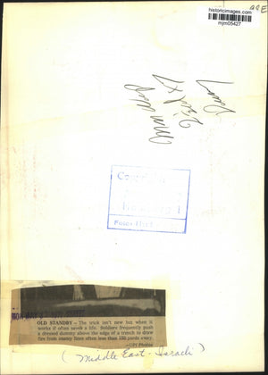 Old standby---The trick isn't new but when it works it often saves a life. Soldiers frequently push a dressed dummy above the edge of a trench to draw fire from enemy lines often less than 150 yards away (Israel) (Middle East-Israeli)