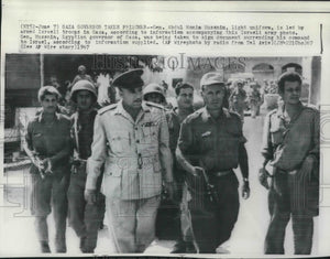 Gaza governor taken prisoner---General Abdul Monim Hussnin , light uniform, is led by armed Irsaeli troops in Gaza, according to information accompanying this Israeli army photo. General Hussnin, Egyptian governor of Gaza, was being taken to sign document surrounding his command to Israel, according to information supplied (Gaza, Gordan) (Middle East Prisoners)