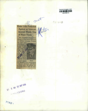 General Laurence S. Kuter, commander of the North American air defense command, Wednesday night urged development of an anti-ballistic-missile system and a new long range interceptor for destroying enemy bombers before they launched...nuclear weapons. Kuter, whose command covers the defense of the entire North American continent, said those problems were the primary deficiencies which must be overcome.