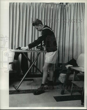1963 Press Photo Seaman William Ortuay of New York presses pants in Milwaukee