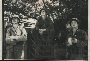 Activities of United States airplanes near the front lines in South Korea were being observed by these 1st cavalry division men. They are (from left) Private First Class's Walter Oak, Fergus Falls, Minnesota; Charles Melton, Spooner, Wisconsin; Robert Payne, Michigan City, Indiana, and Harland C. Thoan, Ashland, Wisconsin. The picture was made near Yongdong, now in Communist hands. Korea War - Troops - United States - Miscellaneous. Boys.
