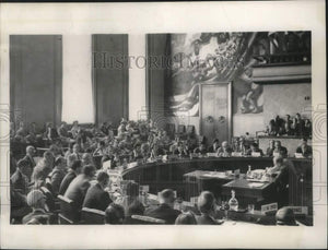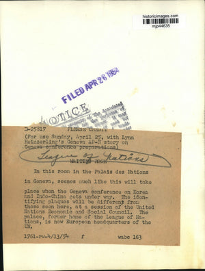 In this room in the Palais des Nations in Geneva, scenes much like this will take place when Geneva conference on Korea and Indo-China gets under way. The identifying plaques will be different from those seen here, at a session of the United Nations Economic and Social Council. The palace, former home of the League of Nations, is now European headquarters of the UN.