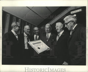 New Inductees - The six newest members of the Wisconsin Athletics Hall of Fame admired one of the certificates commemorating their induction at the 20th anniversary dinner at the Arena Thursday night. From left were Chuck Fenske, Ken Keltner, Billy Sixty, Harold (Bud) Foster, John Sisk and August (Mike) Michalske. Their induction raises membership in the Hall of Fame to 57. The dinner drew a record crowd of 1,160.