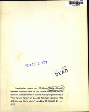 Investigative reporter Jerry McKibbon (William Holden) uncovers syndicate crime in city politics, while pursuing the beautiful chief researcher of a crime investigating committee in "The Turning Point," on the ABC Television Network's "The ABC Monday Night Movie," on July 15 (9:00-10:45 pm, EDT).