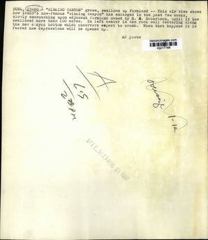 Buhl, Idaho--"Sinking Canyon" grows, swallows up farmland. This air view shows how Idaho's now-famous "sinking canyon" has enlarged in the past few weeks, slowly encroaching upon adjacent farmland owned by HA Robertson, until it has swallowed more than 100 acres. In left center is the rock wall teetering along the new canyon bottom which observers expect to crash. When that happens it is feared new depressions will be opened up.