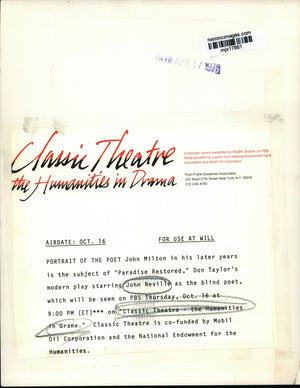 Portrait of the Poet John Milton in his later years is the subject of "Paradise Restored," Don Taylor's modern play starring John Neville as the blind poet, which will be seen on PBS Thursday, Oct. 16 at 9:00 pm (ET) on "Classic Theater-the Humanities in Drama." Classic Theater is co-founded by Mobil Oil Corporation and the National Endowment for the Humanities.