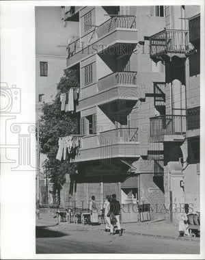 A waiter stood near the tables of a sidewalk cafe ready to serve the first customers of the day in an area of rather modern apartment buildings. On the upper floors, clothes were hung from balconies to dry in the hot, brilliant sun.
