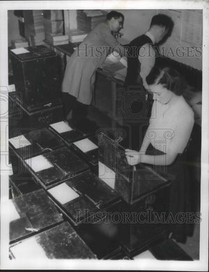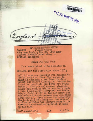 England. In a scene about to be repeated in England for the first time since 1951, ballot boxes are prepared for sending to the polling stations. The worker in front is checking directives inside a ballot box before closing it. Behind her directive pamphlets and forms are being sorted. Charges and counter charges, claims and counter claims are being made by the Conservative Party and the challenging Labor Party as the day nears for the fourth British general election since World War II. Each blames the other for the high cost of living and the rash of strikes on which the average voter's interest is centered as he tries to make up his mind.