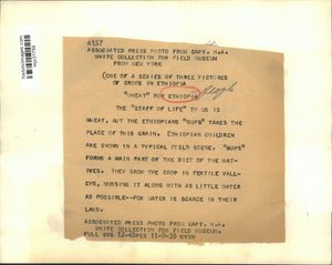 Wheat for Ethiopia. The "Staff of Life" to us is wheat, but the Ethiopians "Gups" takes the place of this grain. Ethiopian children are shown in a typical field scene. "Gups" form a a man part to he diet of the natives. They grow the corp in fertile valleys, nursing it along with a as little water as possible--for water is scarce in their land.