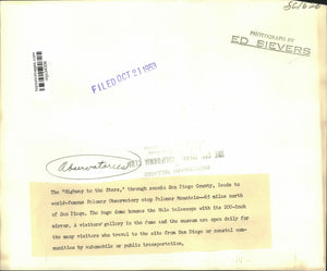 The "Highway to the Stars," through scenic Sad Diego County, leads to world-famous Palomar Observatory atop Palomar Mountain- 65 miles north of San Diego. The huge dome and the museum are open daily for the many visitors who travel to the site from San Diego or coastal communities by automobile or public transportation.
