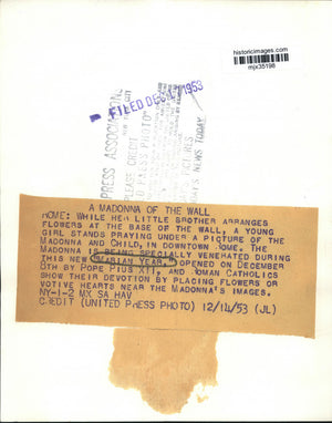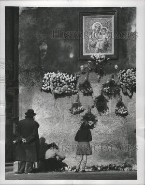 Rome: A Madonna Of The Wall -- While her little brother arranges flowers at the base of the wall, a young girl stands praying under a picture of the Madonna and Child, in downtown Rome. The Madonna is being specially venerated during this new "Marian Year," opened on December 8th by Pope Pius XII, and Roman Catholics show their devotion by placing flowers or votive hearts near the Madonna's images. Marian Year