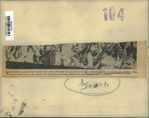 Watching a parade that lasted most of the afternoon was the duty of President Roosevelt after he took the oath of office. This picture shows pat of the parade as it passed the reviewing stand on Pennsylvania av.