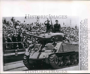 An Israeli army tank moves past reviewing stand during parade in Jerusalem today celebrating Israel's 13th anniversary as a nation. Men in civilian dress on dais are white-haired Premier David Ben-Gurion, left, and President Izhak Ben Zvi. Israel-Demonstration