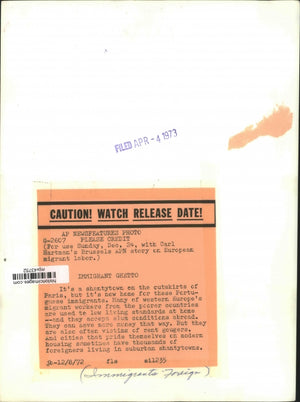 It's a shantytown on the outskirts of Paris, but it's now home for these Portuguese immigrants. Many of western Europe's migrant workers from the poorer countries are used to low living standards at home and they accept slum conditions abroad. They can save more money that way. But they are also often victims of rent gougers. And cities that pride themselves on modern housing sometimes have thousands of foreigners living in suburban shantytowns. Immigrants-Foreign
