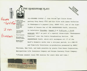 John Stride and Claire Bloom portray King Henry VIII and his first wife Queen Katharine in Shakespeare's pageant play, Henry VIII, one of the highlights of Season One of "The Shakespeare Plays," returning to television Thursday, August 9 at 9 pm - 12 midnight (ET) as part of a special three-night "Shakespeare Festival" over the Public Broadcasting Service. "The Shakespeare Plays," which will encompass all 37 of the bard's dramatic works over a six-year period, is a BBC-TV and Time-Life Television co-production presented by WNET/Thirteen, New York, and made possible by grants from Exxon Corporation, Metropolitan Life Insurance Company and Morgan Guaranty Trust Company. Claire Bloom is Queen Katharine and John Stride has the title role in Shakespeare's "Henry VIII" Saturday noon on Channel 10.