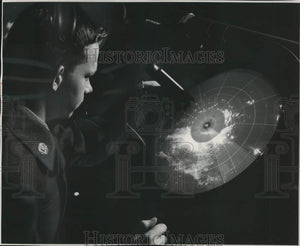 View shows closeup of entry console in the forerunner of the Missile Master system at Fort George Meade, Maryland. Operator enters target into electronic tracking system with photo-electric light gun placed against the face of the screen. Developed by Martin for the United States Army. Released by Department of Defense