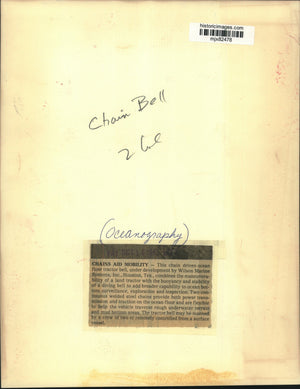 Chains Aid Mobility-This chain driven ocean floor tractor bell, under development by Wilson Marine Systems, Inc., Houston, Texas, combines the maneuverability of a land tractor with the buoyancy and stability of a diving bell to add broader capability to ocean bottom surveillance, exploration and inspection. Two continuous welded steel chains provide both power transmission and traction on the ocean floor and are flexible to help the vehicle transverse rough underwater terrain and mud bottom areas. The tractor bell may be manned by a crew of two or remotely controlled from a surface vessel. Oceanography.