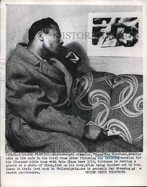 1952 Press Photo Sugar Ray Robinson Gazes At Picture Of Knocked Out Bobo Olson