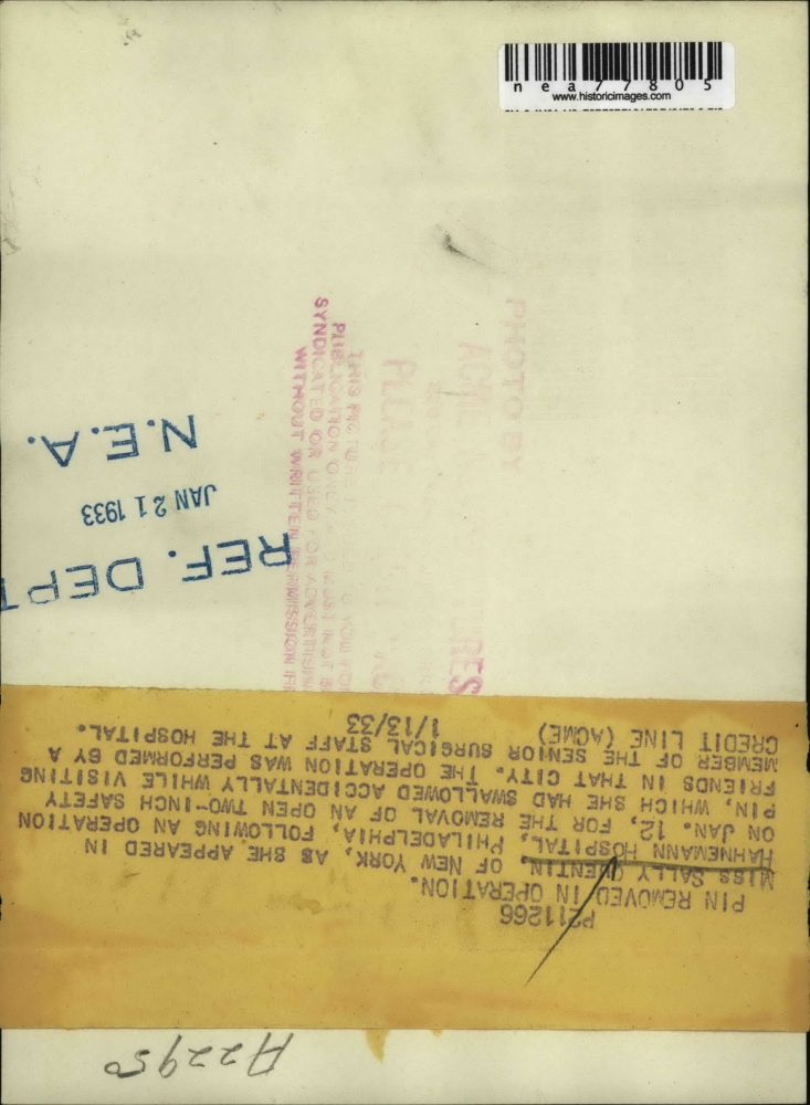 1933 Press Photo Sally Quentin in Hahnemann Hosp. after op to remove safety pin