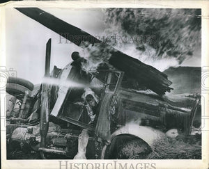 1950 Press Photo A driver pinned in a truck that is on fire - nea88633