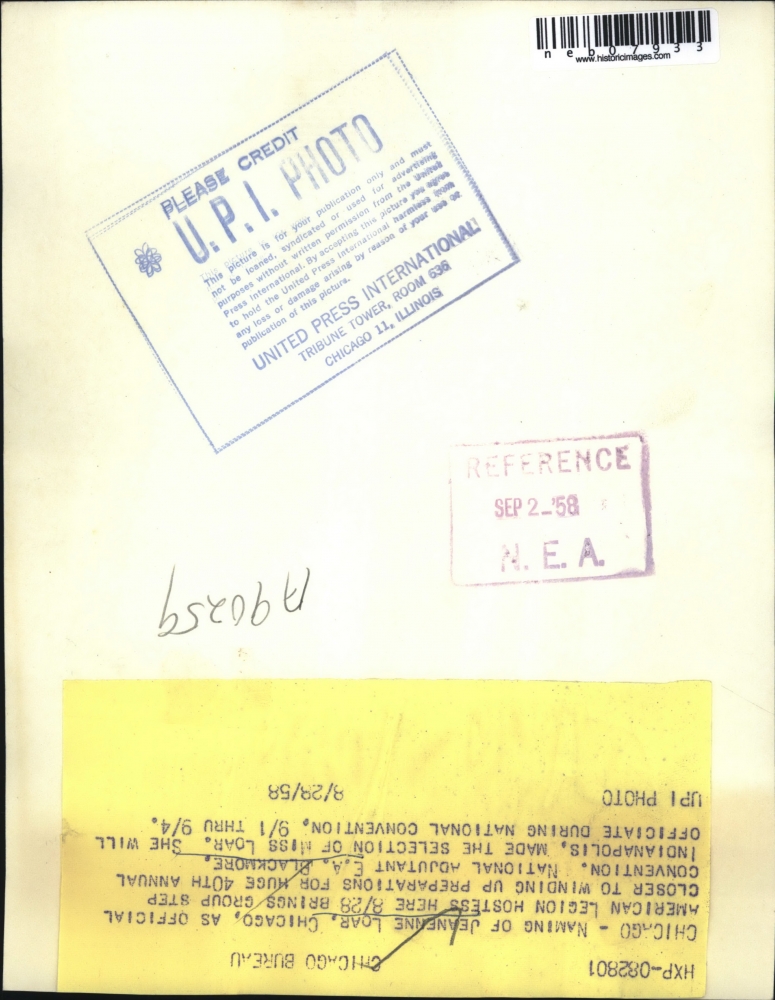 Credit - UPI and NEA National adjutant E.A. Blackmore, Indianapolis, made the selection of Miss Loar. She will officiate during the 40th National Con