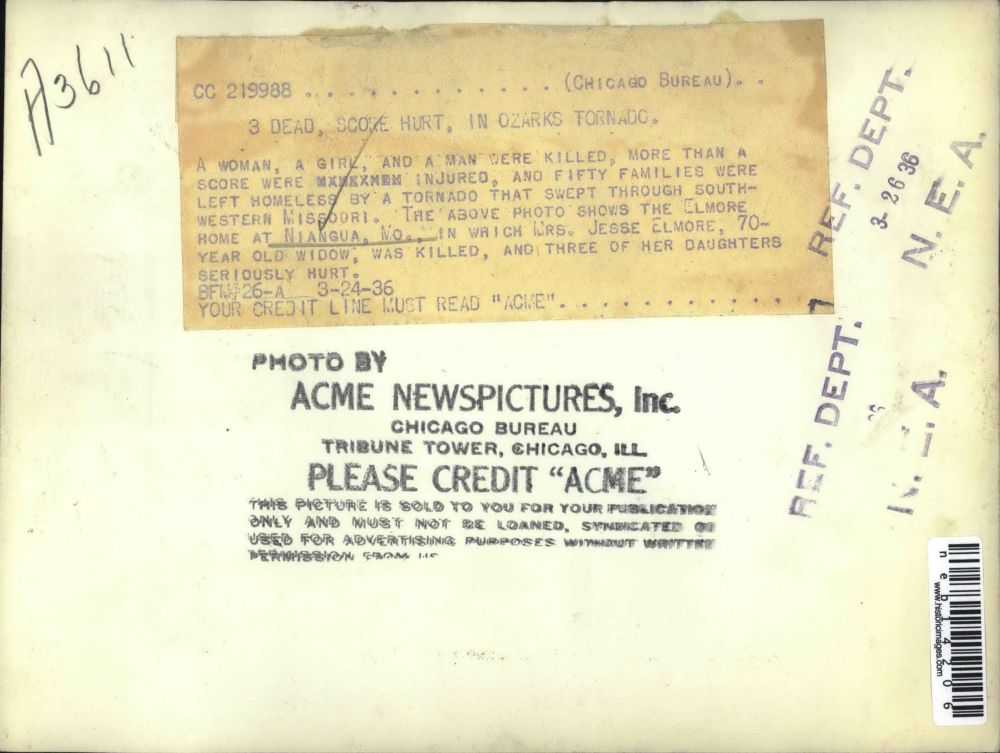 1936 Press Photo Niangua, Mo. wreckage left by a tornado that 3 people