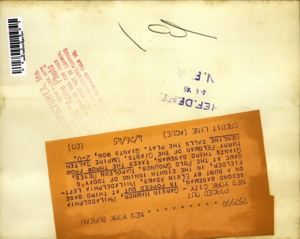 1945 Press Photo Phillie 2nd baseman Garvin Hamner vs Giants Napoleon Reyes