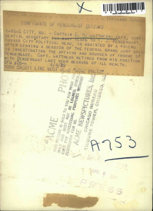 1939 Press Photo Captain Mattheus & friend at Kansas City case on TJ Pendergast