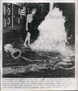 1951 Press Photo Alaene Taulbee wets feet in broken fire hydrant