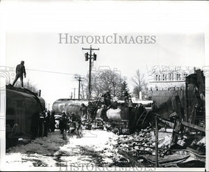 1970 Press Photo The aftermath of a train wreck with fire removed by fire men.