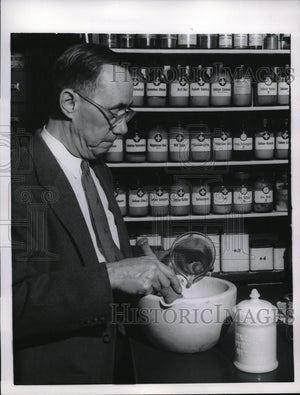 1957 Press Photo pharmacist making drugs with a mortal and pestle