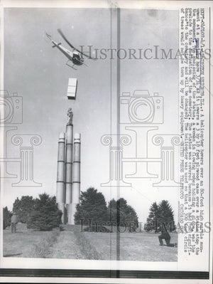 1958 Press Photo Helicopter Hovers Over Marble Monument to Cover Statue