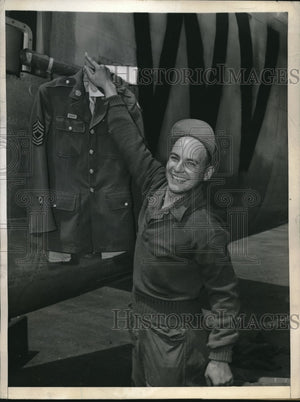 1945 Press Photo M/SGT Harry Hirst of Chicago Hangs Clothes on Machine Gun