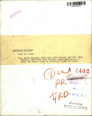 1947 Press Photo Mrs Marie Krieger, Mrs Mary Koudala, crane operators at ALCOA