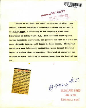 1960 Press Photo Pretty Judith Pardi Examines GE Thermionic Electric Converters