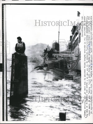1961 Press Photo Mike Nelan sits on top of the after-fin of US atomic submarine