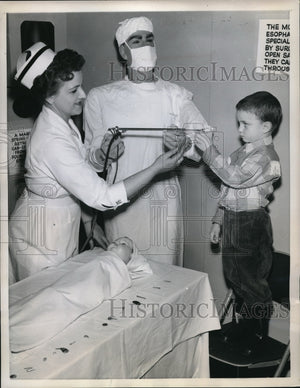 1960 Press Photo Dr. displays for eps used to remove safety pins from kids tummy