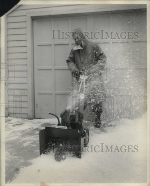 1959 Press Photo Man using snow blower to clear homes driveway